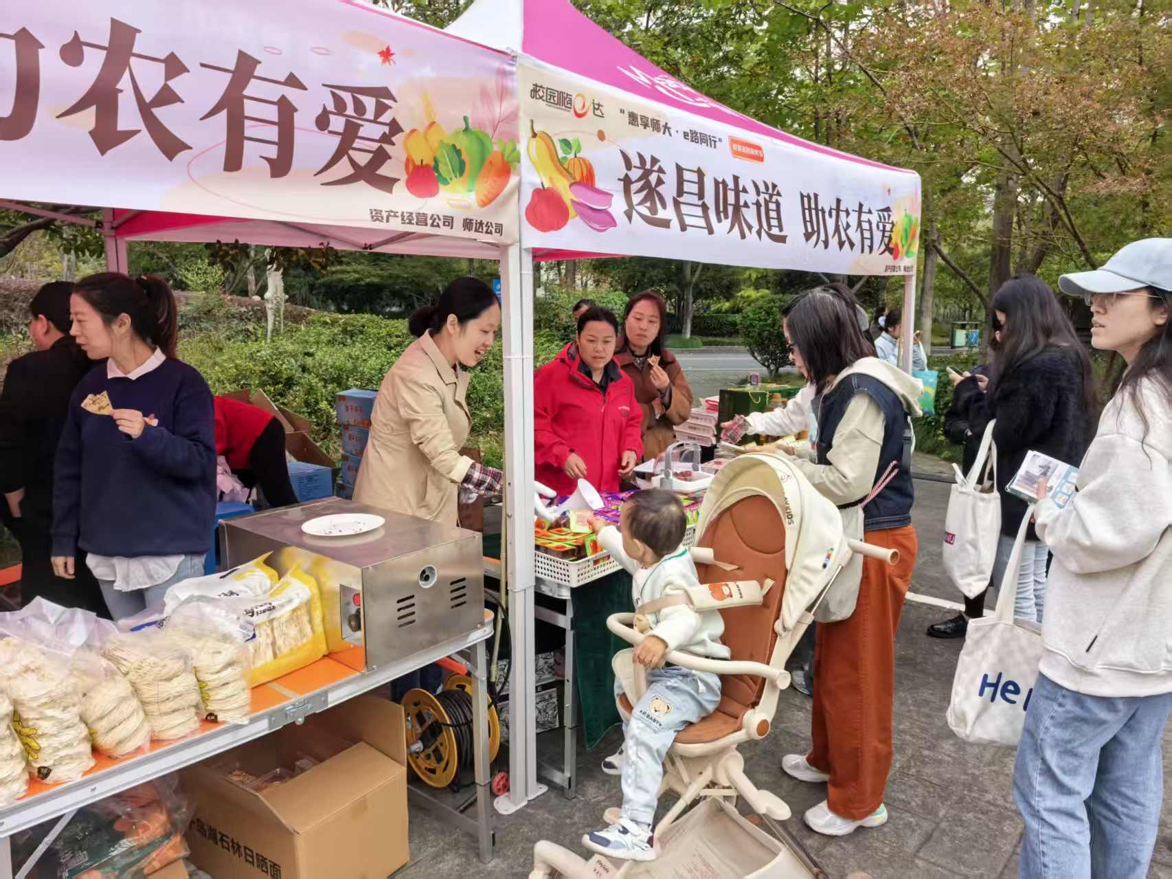 11月5日、7日,金秋服务月活动分别在仓前、下沙校区线下启幕,活动现场,商铺促销、文创展销精彩纷呈!师生扫码即可领取手机支架与折扣券;师达云超“1元购”、助农山货试吃打折等活动更是掀起热潮。无人机展示、校园美食、研学宣推等环节进一步丰富了现场体验。随e达师大生活平台同步联动,让未到场的师生也能尽享优惠!
