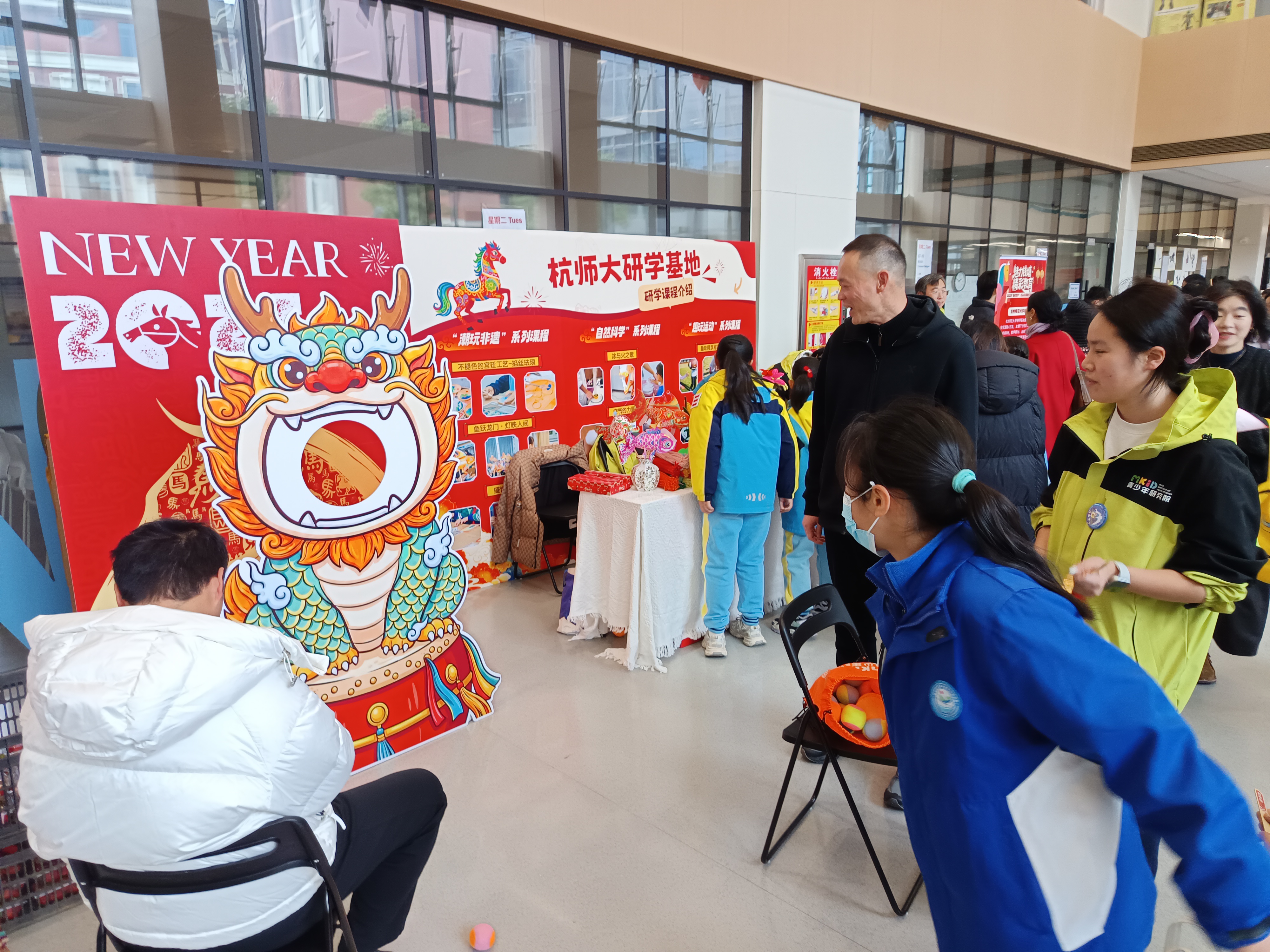 1月18日,杭师大研学基地受邀亮相“魅力钱塘、精彩教育”优学育人成果展暨创意赶春集市。作为研学基地的代表,杭师大研学基地以丰富多元的特色课程与趣味互动,成为展会现场焦点。基地展位前,非遗传承类课程尽显传统文化魅力;绒花制作的细腻雅致、掐丝珐琅的流光溢彩、鱼灯手作的灵动精巧,让来访师生沉浸式感受传统技艺的匠心传承。